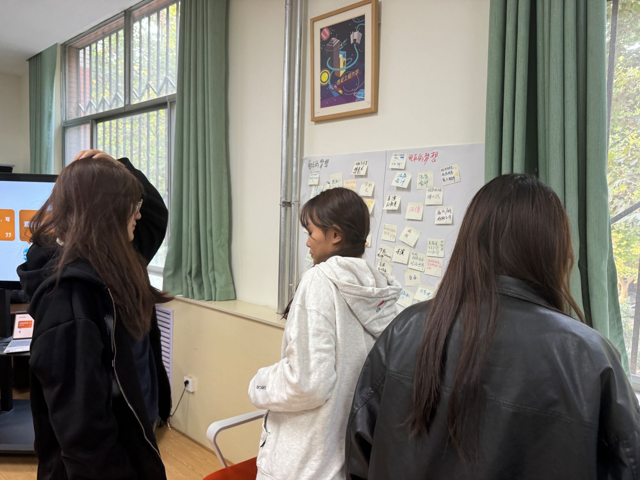 在互动环节中,刘老师通过“梦想启发”的方式,让同学们在纸上书写自己的梦想,并拿出一些带有不同梦想的工具卡牌,让同学们进行选择,并与大家一起交流每个人选择卡牌的原因和想法。随后现场进行了分组,并将各组成员的梦想连成一个故事,用画笔将受到生涯启发的想法画在纸上,通过环游世界、吃遍美食、多彩生活等生动活泼的思维启发,极大地激发了同学们对生涯规划的兴趣,增强了对学业发展的体验。