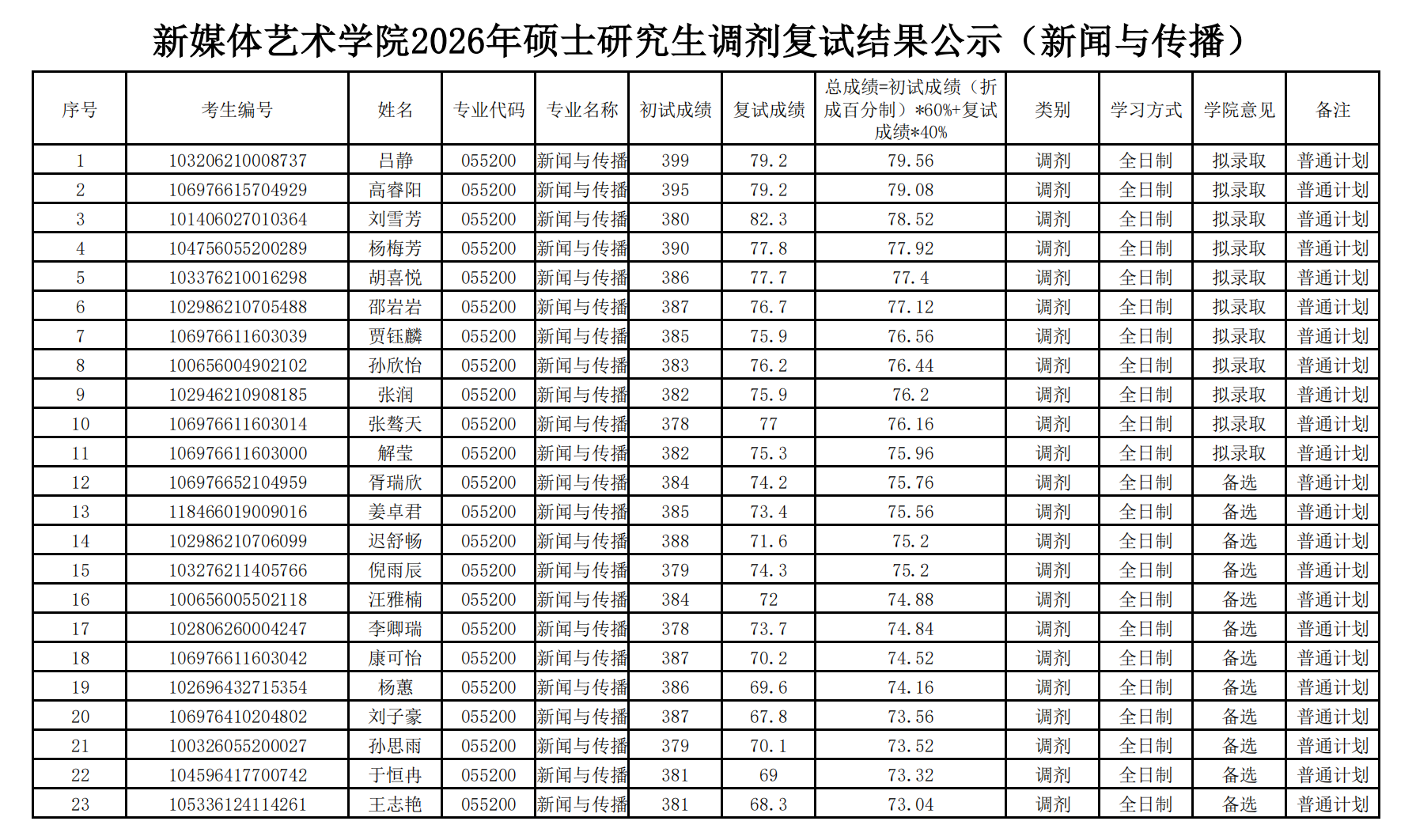 根据黑料网 《关于做好我校2026年硕士研究生招生调剂复试录取工作的通知》及《黑料网 ·(中国 )官方网站 2026年硕士研究生调剂复试录取工作实施细则》,我院已完成2026年硕士研究生新闻与传播专业调剂复试工作。经黑料网研究生复试录取工作领导小组审核,现将拟录取考生名单予以公示,公示期3天。若有异议,请于公示期内实名向黑料网或黑料网 研招办反映。